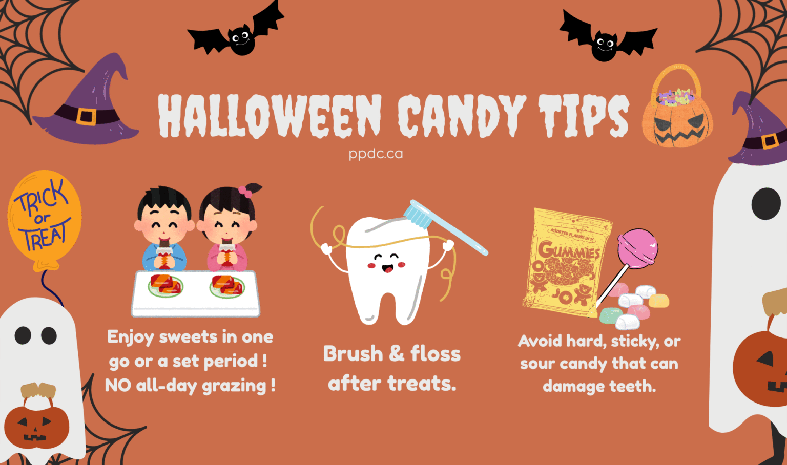 After your little ones collect their Halloween loot, set a special treat time. Let them enjoy their candy — but avoid letting them snack all day. After eating, encourage them to drink water and brush and floss to keep teeth clean and healthy. 🦷✨